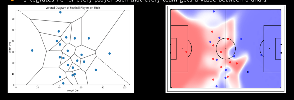 Ook heeft hij de manier om de pitch control van de 2 teams op elk moment in de wedstrijd te berekenen enorm veel (3 ordes van grootte) sneller gemaakt. Pitch control geeft aan welk deel van het veld onder controle is van welke speler en welk team. In het plaatje hieronder rechts.