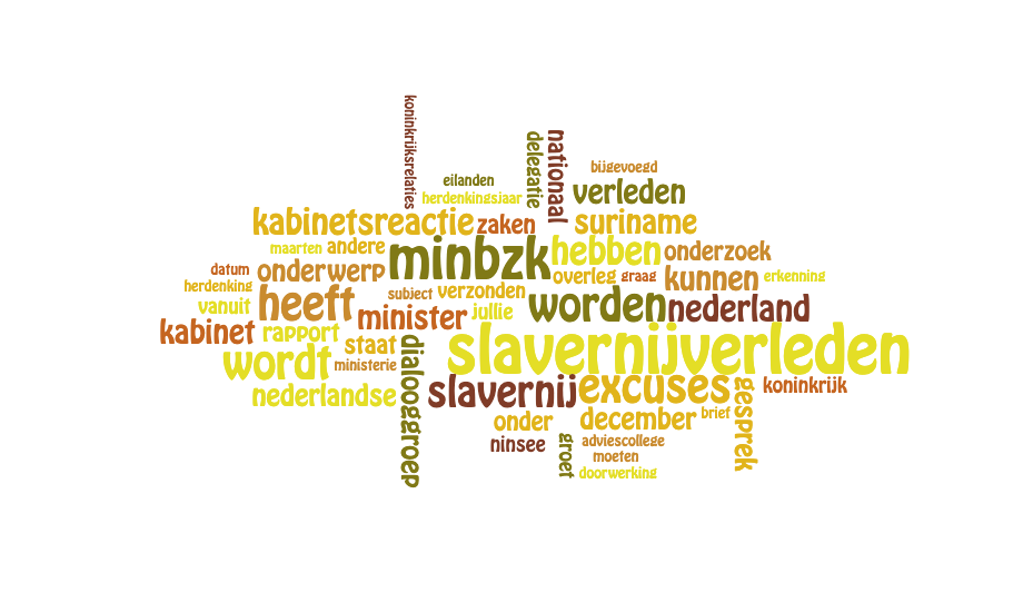 Het Ministerie BZK, het Nationaal Archief en Woogle maken samen een op AI gebaseerd zoeksysteem speciaal voor 1, zeer uitgebreid, Woo verzoek, dat over de excuses voor het slavernijverleden. De meest voorkomende (niet weggelakte) woorden in de meer dan 600 vrijgegeven stukken staan hieronder in een woordenwolk.