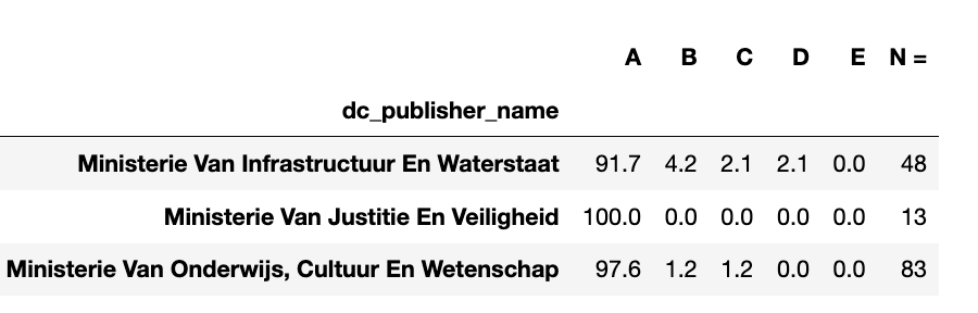 Voor de beslisnota’s is dit enorm goed gelukt. Van de 144 beslisnota’s die na 1 mei 2024 gepubliceerd zijn hebben er 138 de hoogste score. Geweldig! Gefeliciteerd Ministeries. Het is wel jammer dat er slechts 3 van de oude ministeries na 1 mei nog beslisnota’s op open.overheid gepubliceerd hebben. Dus dit zegt allicht nog niet zoveel. Dit is wat we in Woogle hebben zitten vanaf 1 mei: (de N= zijn de aantallen, de andere getallen zijn percentages).