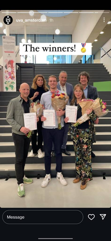 Met zijn werk aan Woogle heeft Maik Larooij de UvA Alumni Impact Prijs 2024 van de Universiteit van Amsterdam gewonnen. Hieronder staat Maik in het midden. Er waren 3 categorieën. Maik won de prijs in Sterke samenleving: bevorderen van een veerkrachtige, rechtvaardige en welvarende maatschappij.