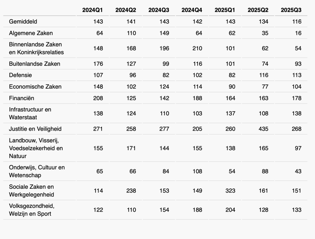 Guido Enthoven, Serv Wiemers en Maarten Marx hebben een artikeltje op iBestuur geplaatst over de waarde van Woo-verzoeken, met de titel Openbaarheid scheidt de bouwers van de knoeiers. Onderstaande tabel geeft de gemiddelde afhandeltijd van een Woo-verzoek per ministerie per kwartaal. De data is afkomstig van het Woo-dashboard. We zien dat in het tweede en derde kwartaal van 2025 de afhandeling over het algemeen een stuk sneller gaat, maar ook dat er grote verschillen zijn tussen de ministeries. Zij hebben natuurlijk ook niet allemaal evenveel verzoeken af te handelen, maar toch.