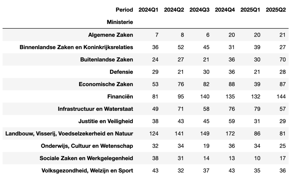 De volgende tabel geeft het aantal genomen besluiten per ministerie per kwartaal. Data van het derde kwartaal van 2025 staat hier nog niet in, want voor dat kwartaal heeft het Woo-dashboard een andere indeling gekregen. De cijfers zijn de rij-sommen van de tweede tabel op het Woo-dashboard genaamd Aantal Woo-verzoeken met besluit per ministerie.
